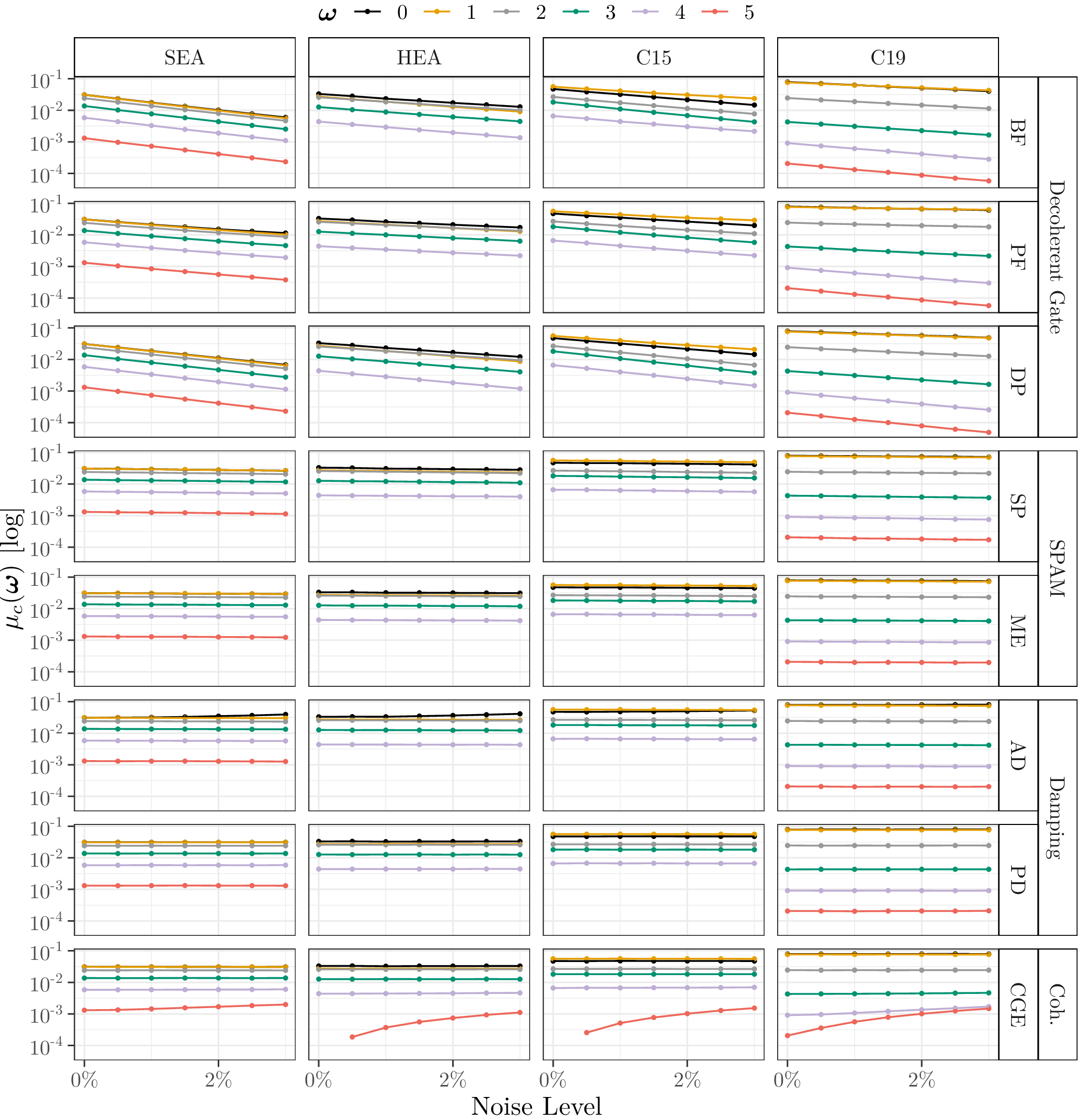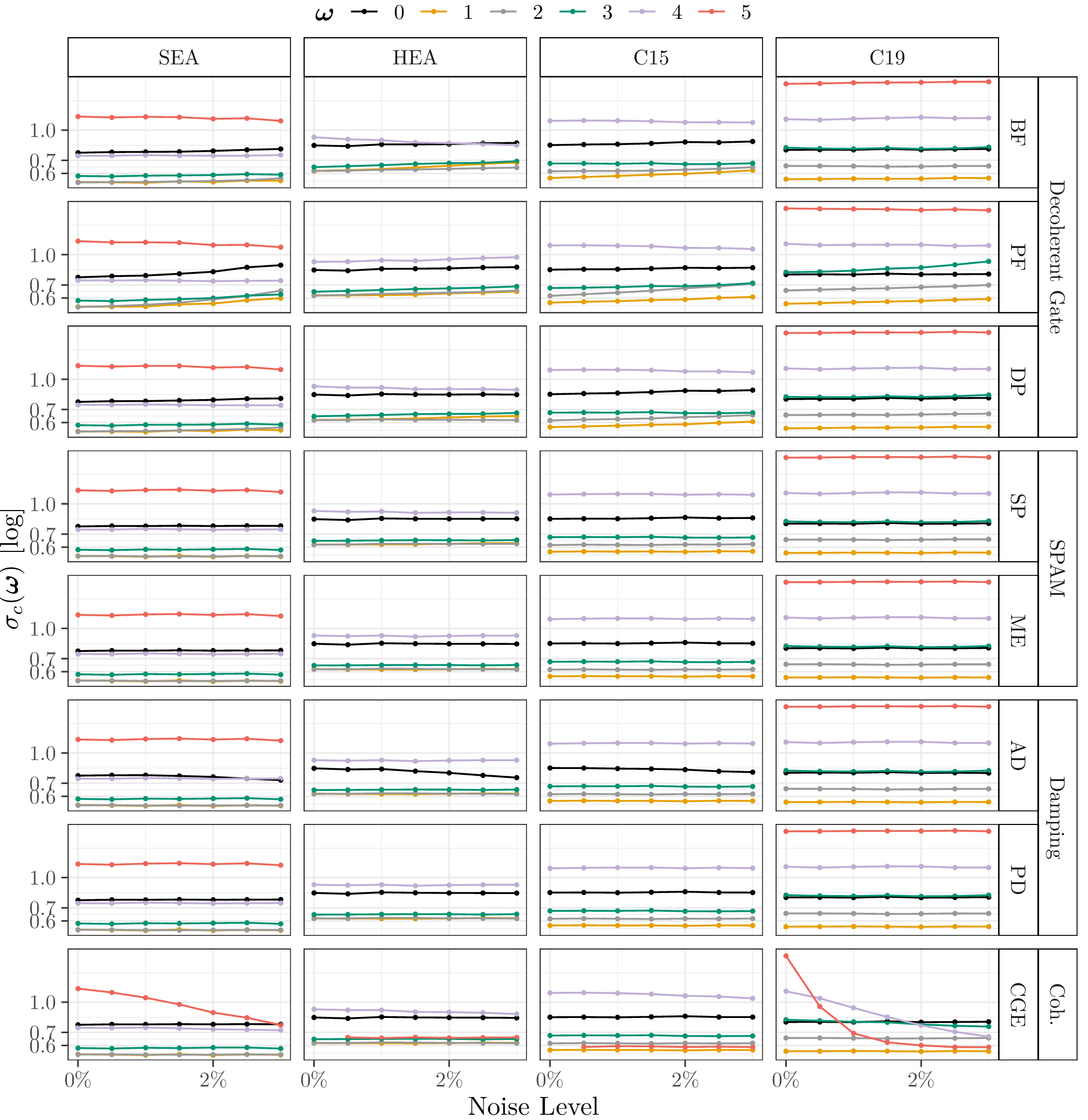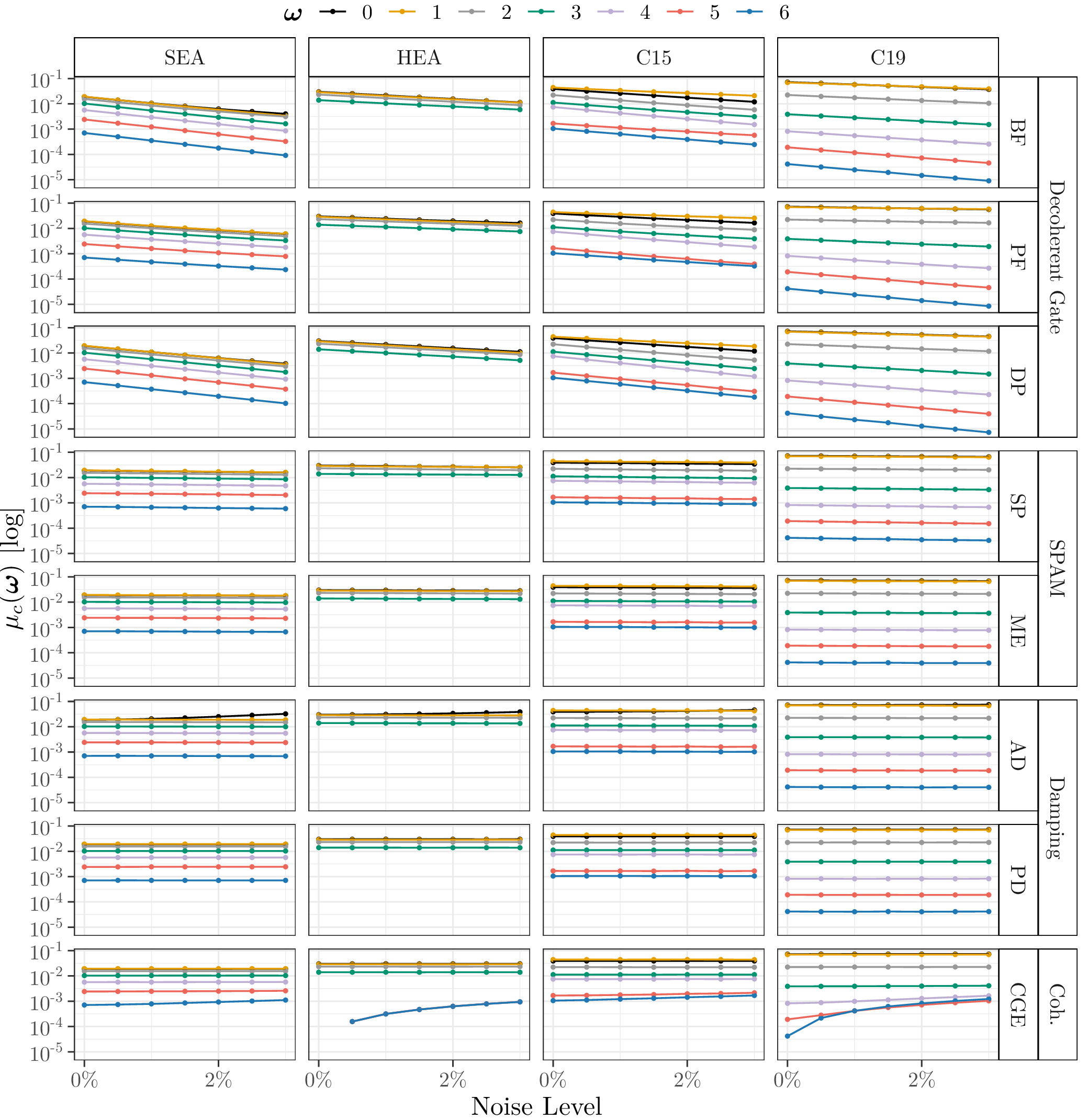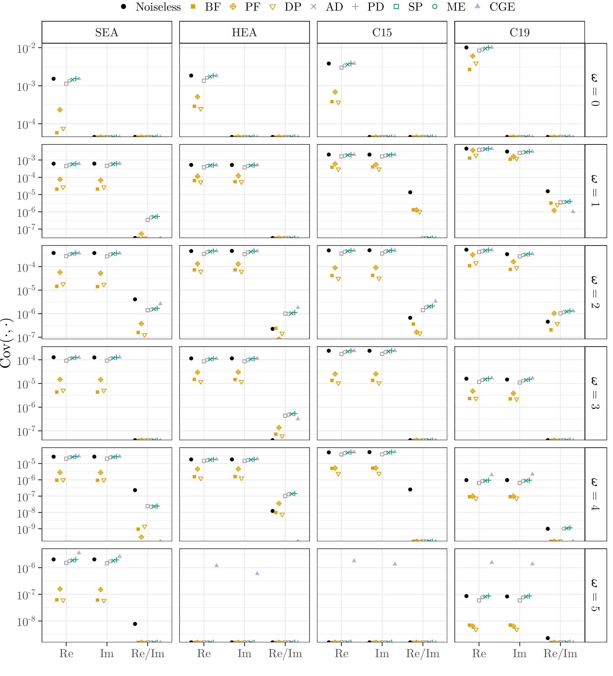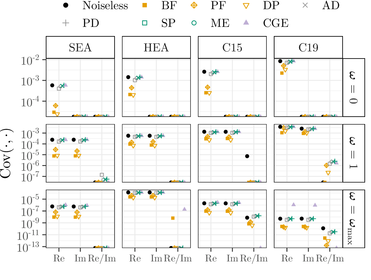 This page lists the individual results for for circuits with the one-dimensional encoding \(R_Y\) and varying qubit counts \([3\dots 6]\). In particular, for each configuration the results comprise of the absolute coefficient mean \(\mu_c(\boldsymbol{\omega})\), the corresponding relative standard deviation \(\sigma_c(\boldsymbol{\omega})\) and the covariance (\(\text{Cov}(\cdot, \cdot)\)). In the paper these results would correspond to Figure 6a, Figure 6b and Figure 4. Shown here are the plots for all qubit numbers.