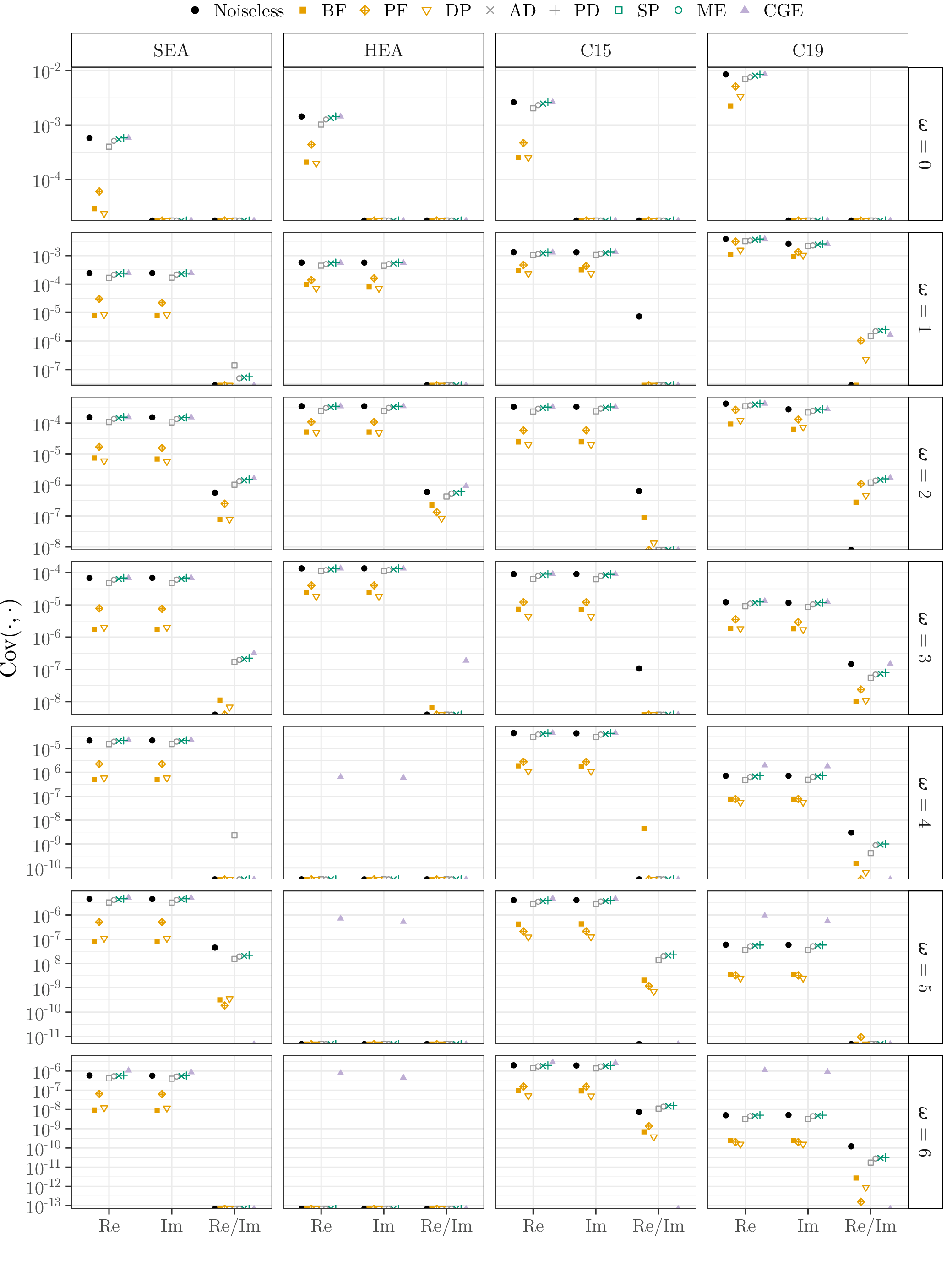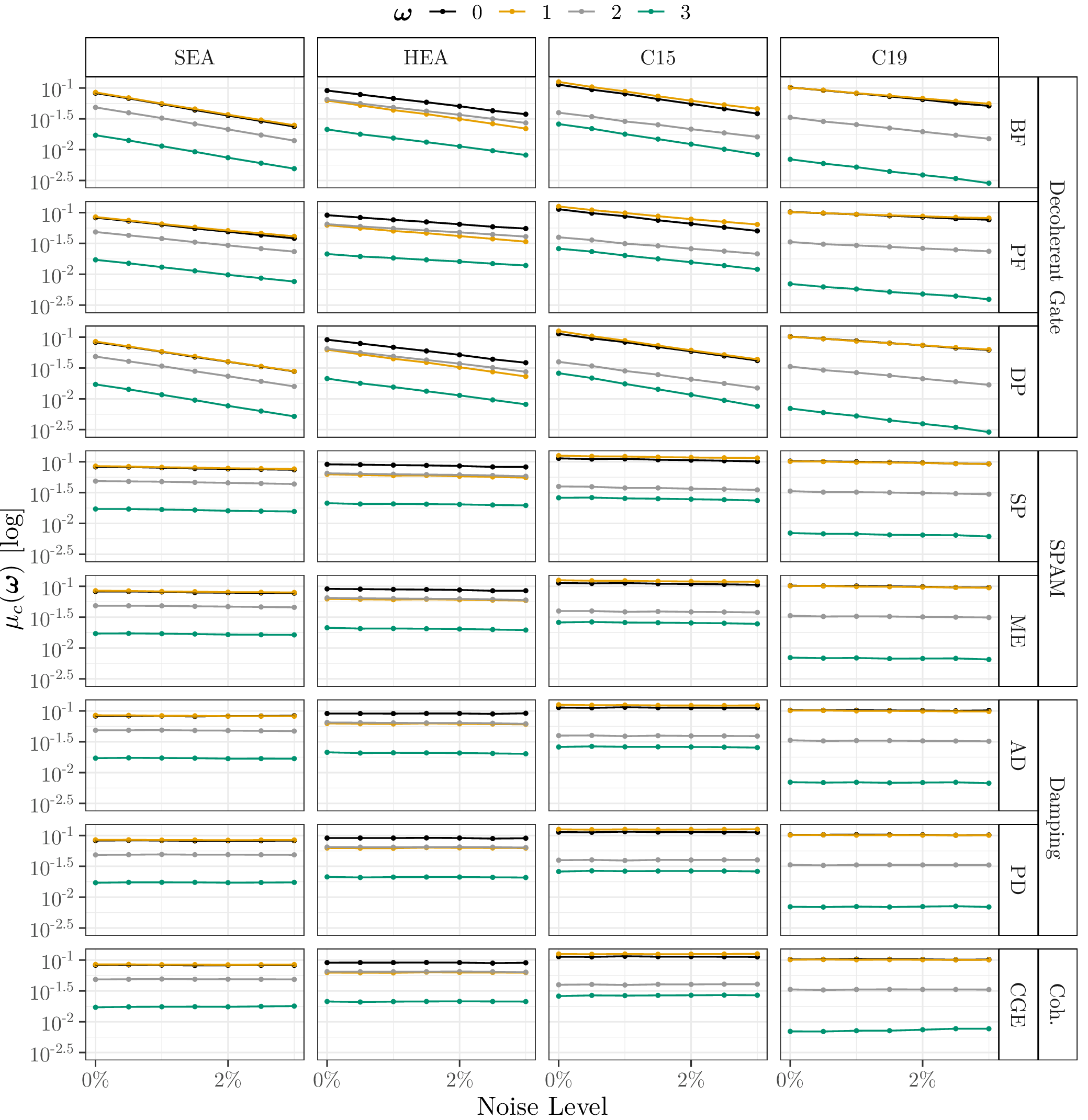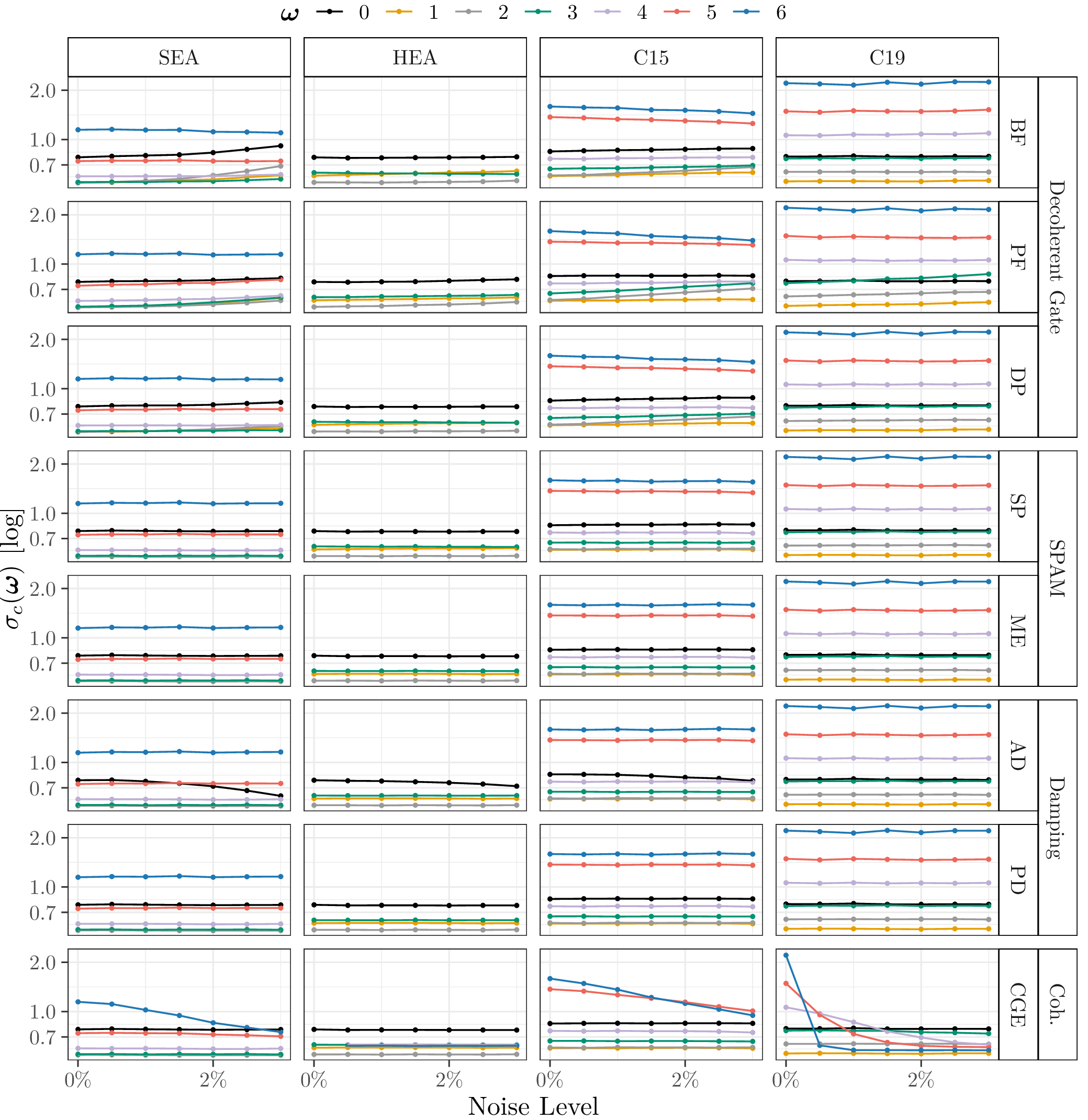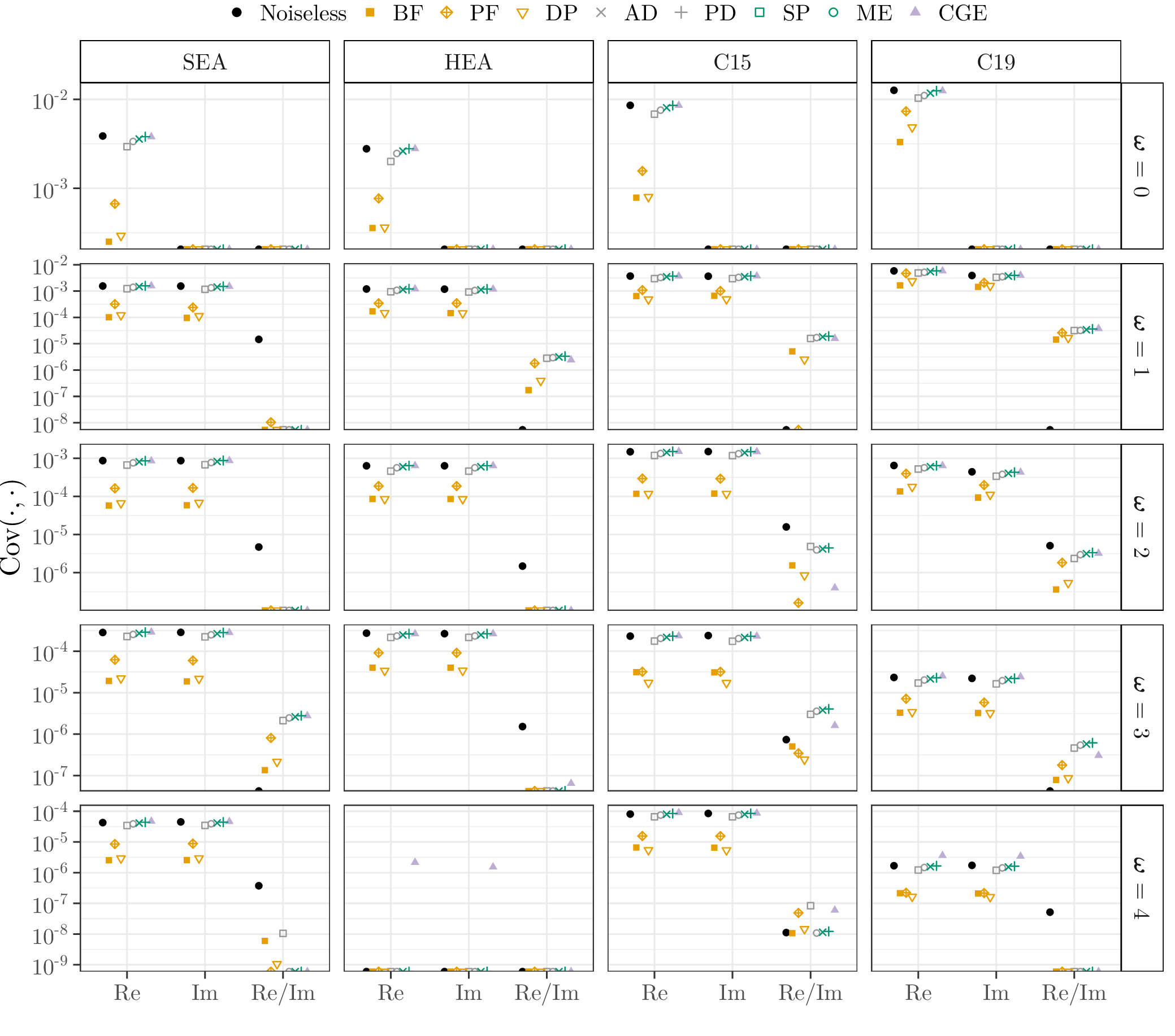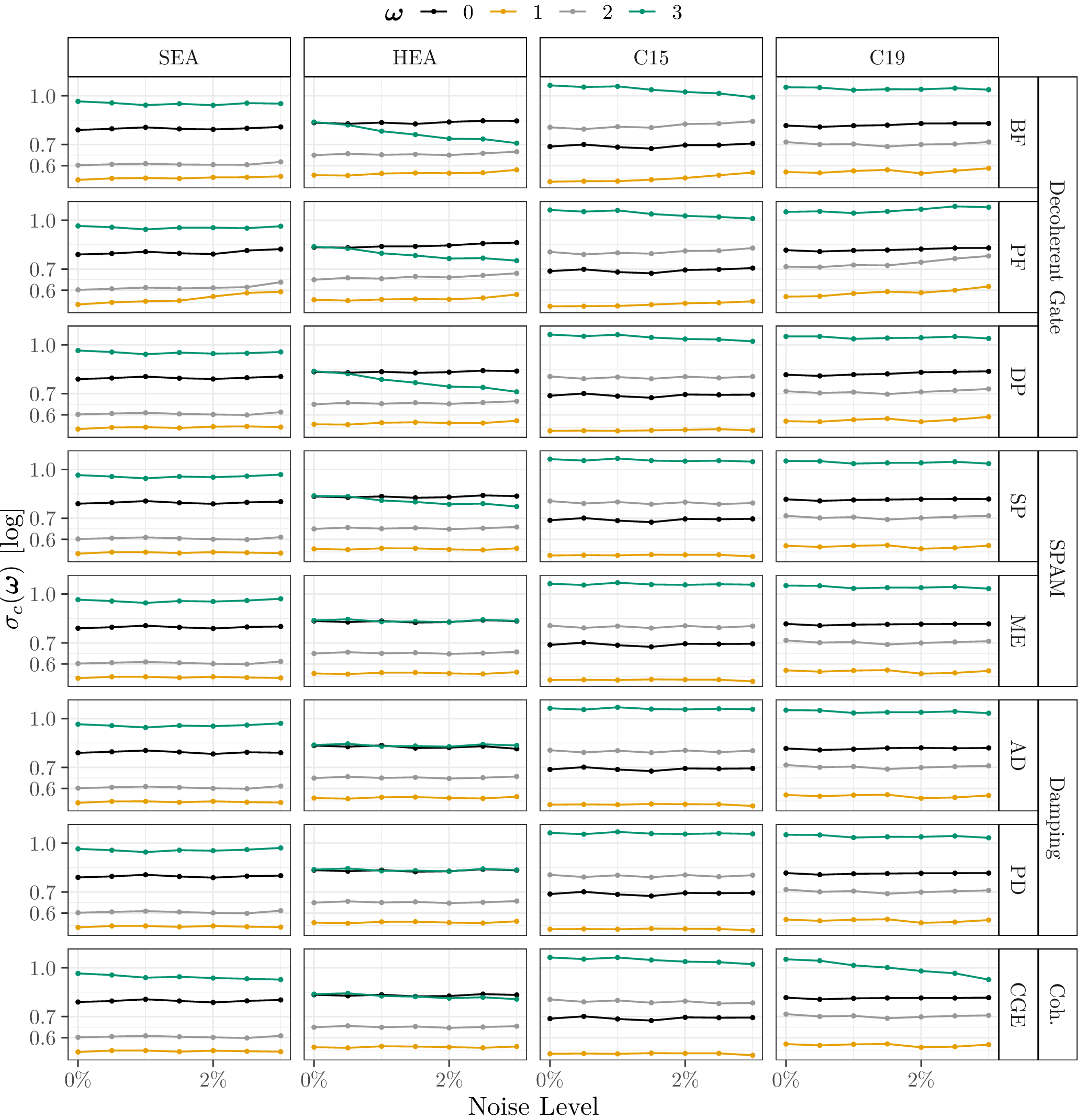 This page lists the individual results for for circuits with the one-dimensional encoding \(R_Y\) and varying qubit counts \([3\dots 6]\). In particular, for each configuration the results comprise of the absolute coefficient mean \(\mu_c(\boldsymbol{\omega})\), the corresponding relative standard deviation \(\sigma_c(\boldsymbol{\omega})\) and the covariance (\(\text{Cov}(\cdot, \cdot)\)). In the paper these results would correspond to Figure 6a, Figure 6b and Figure 4. Shown here are the plots for all qubit numbers.
