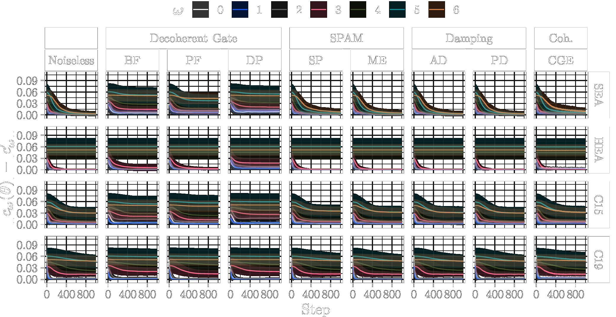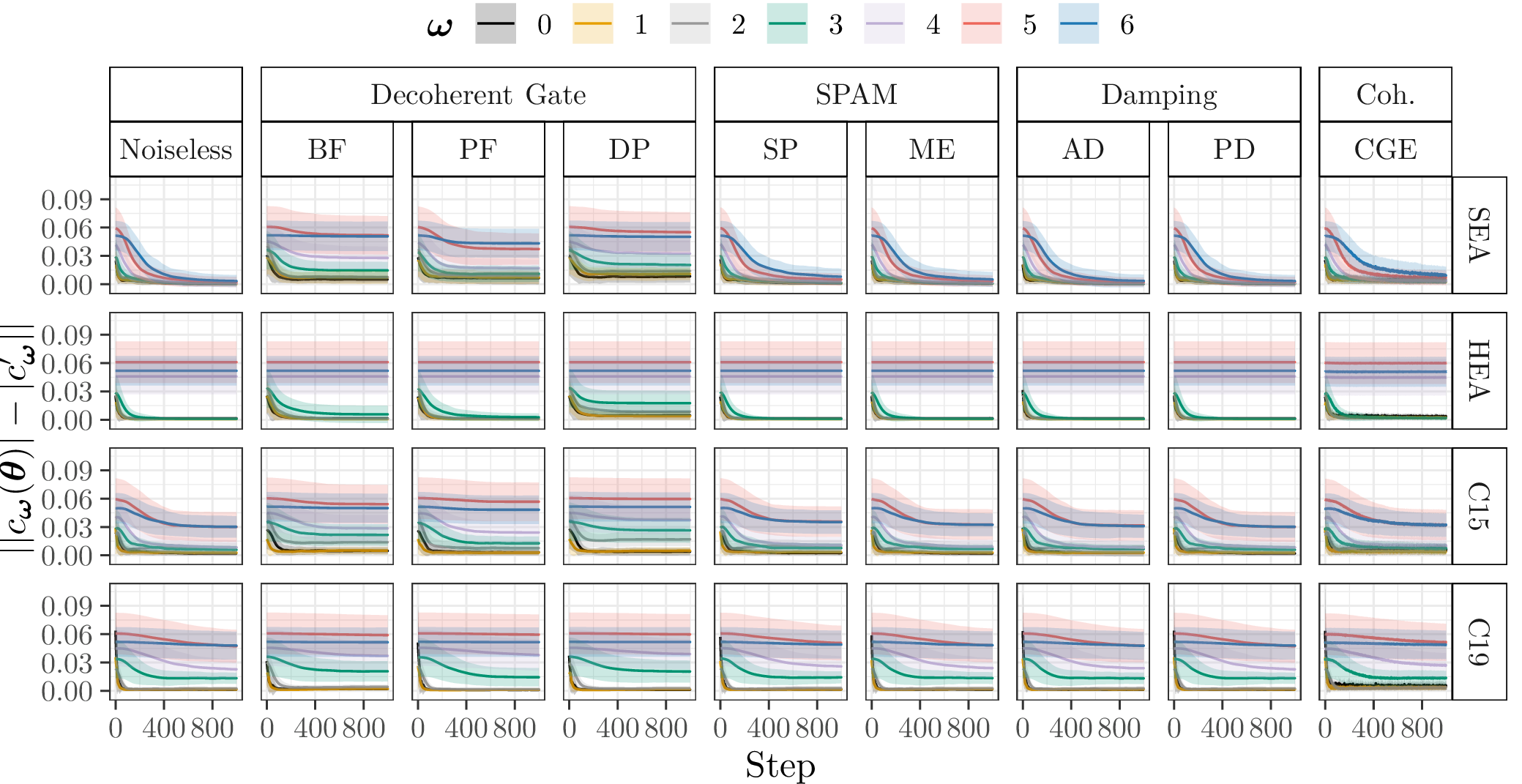 The difference \(\Delta_{c_{\boldsymbol{\omega}}}\) between the target and learned coefficients \(c_{\boldsymbol{\omega}}(\boldsymbol{\theta})\) and \(c'_{\boldsymbol{\omega}}\) respectively of the QFMs averaged over ten model parameter initialisation seeds and ten randomly generated problem instances during training. Lines represent the mean, and shaded areas show the standard deviation over the 10 × 10 configurations.
