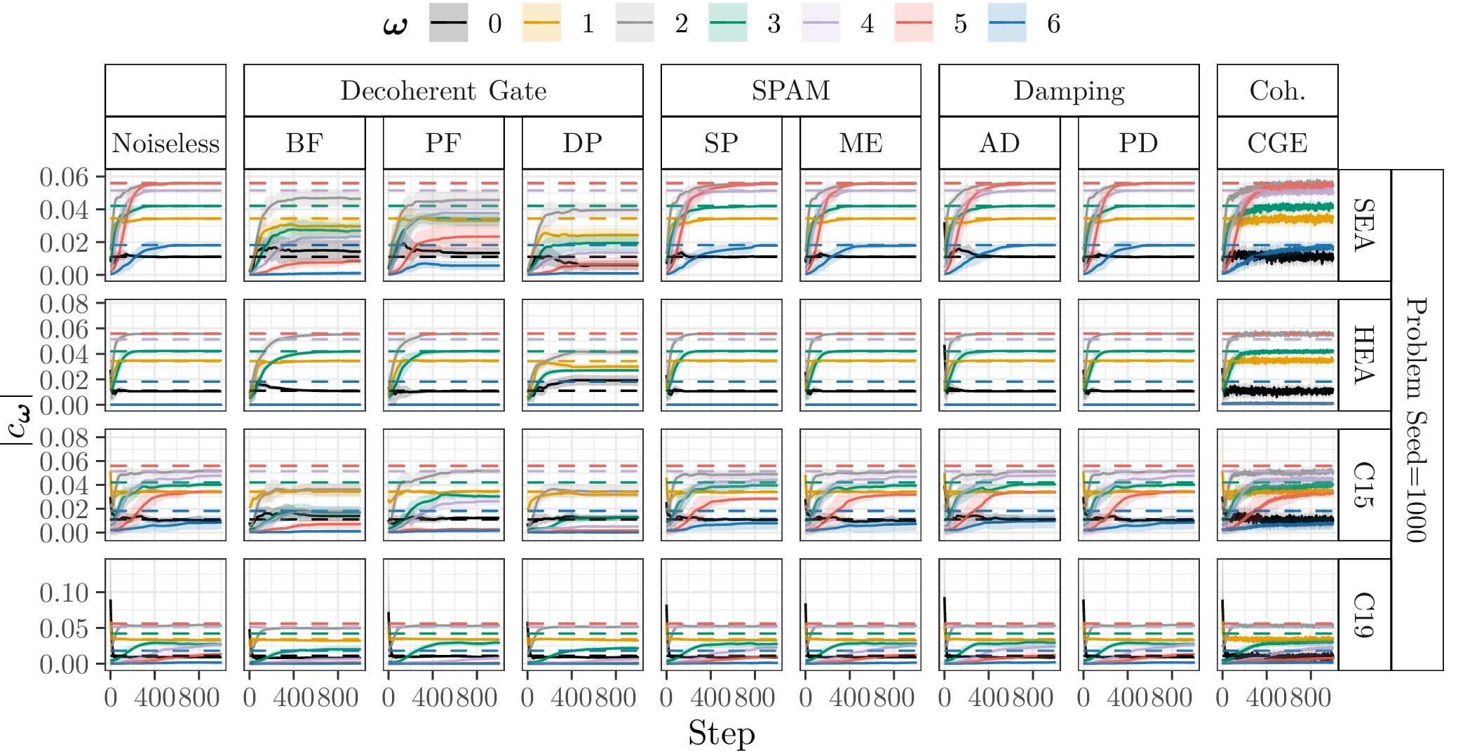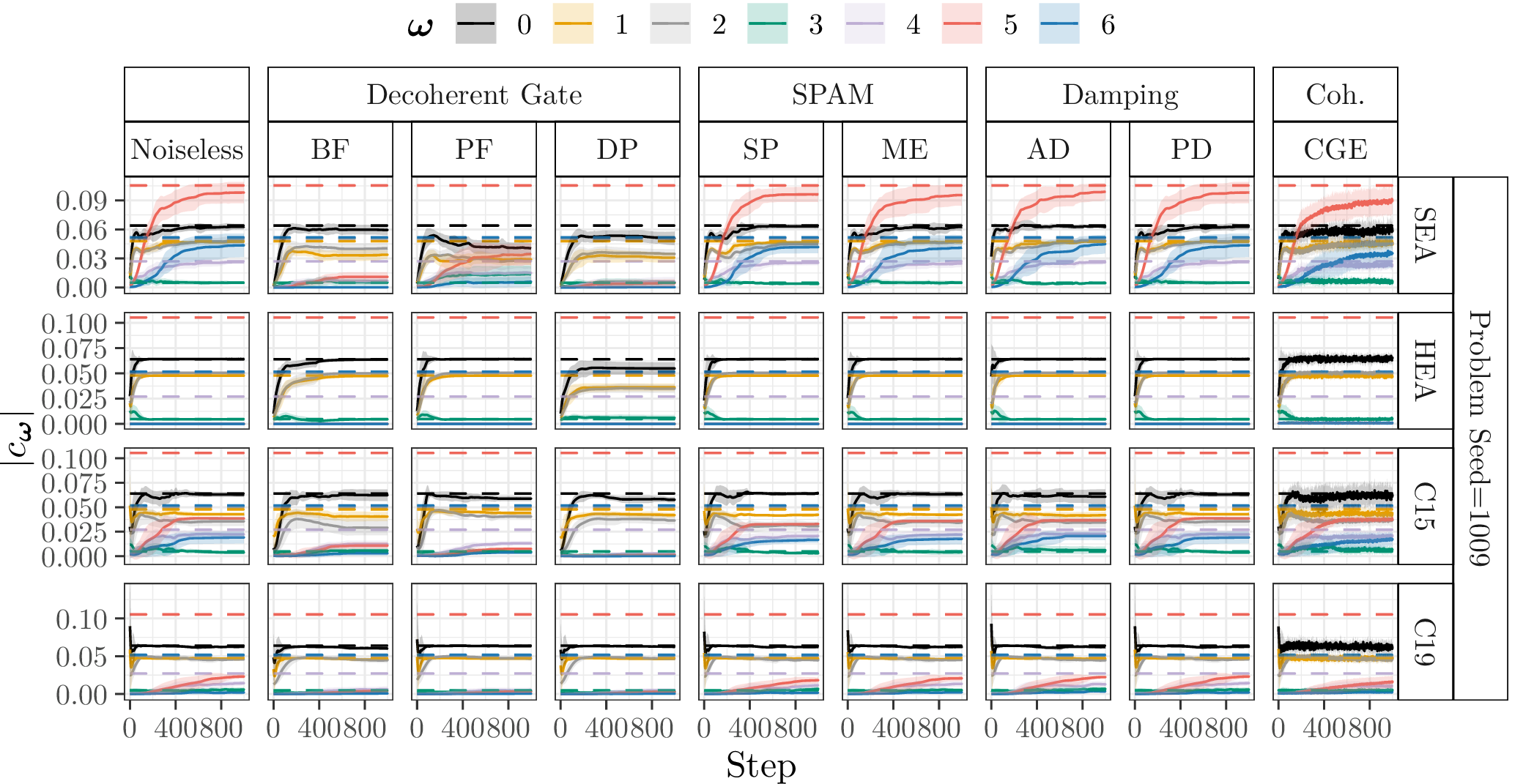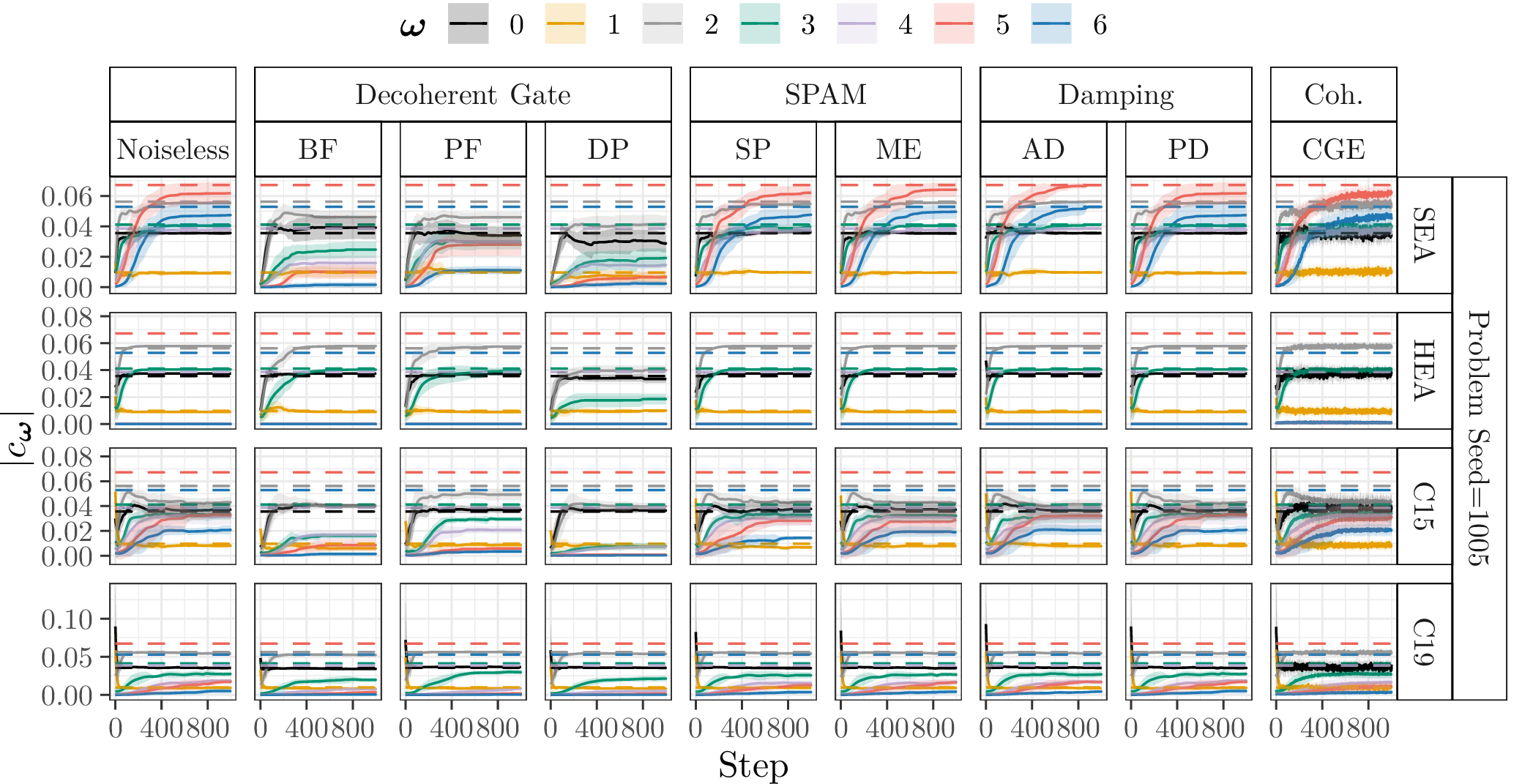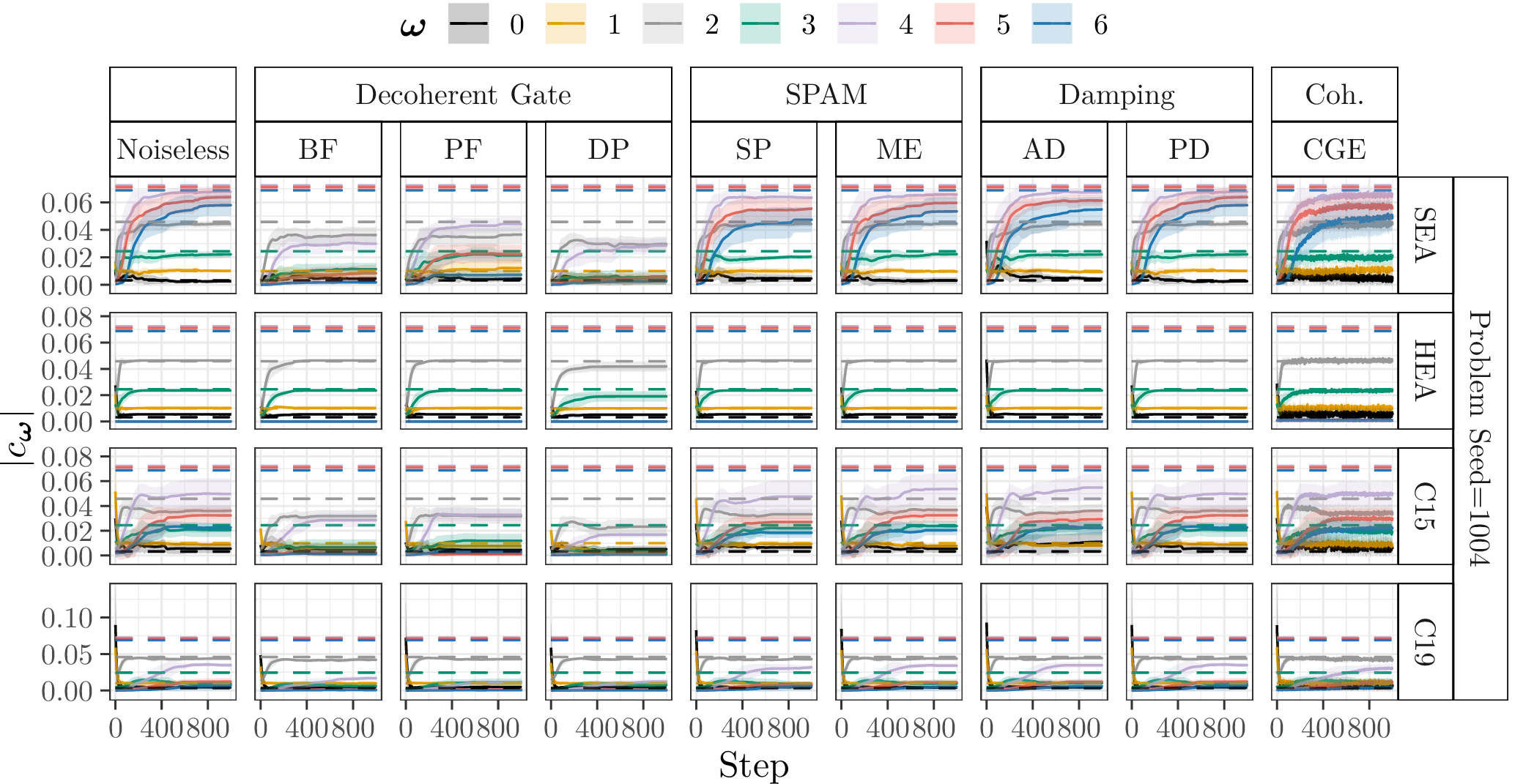 In the following, we show the learned absolute coefficients of the QFMs averaged over ten parameter model initialisation seeds for each single randomly generated probelm instance with seeds \([1000\dots 1009]\) and different types of noise (3%) during training of 1000 steps. In the figures the shaded areas correspond to the standard deviation across the parameter initialisation seeds from the mean. The coefficients of the objective Fourier series are marked with dashed lines.