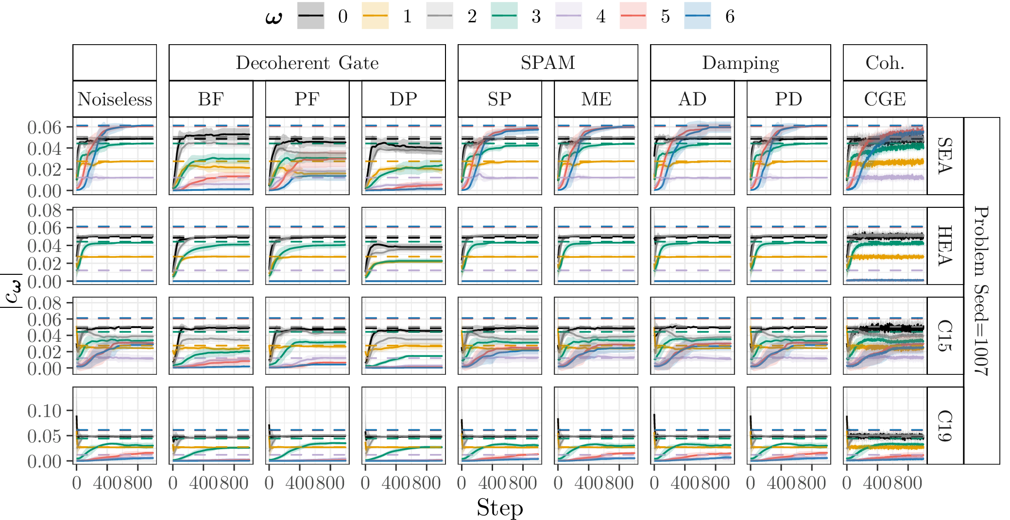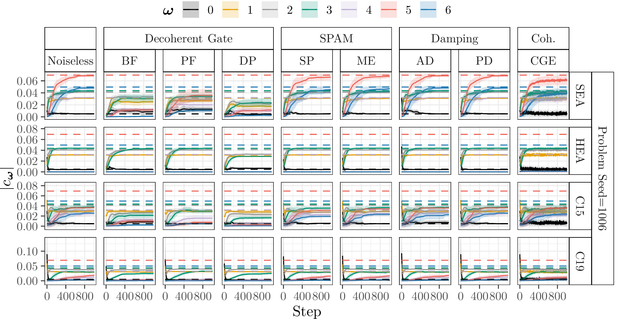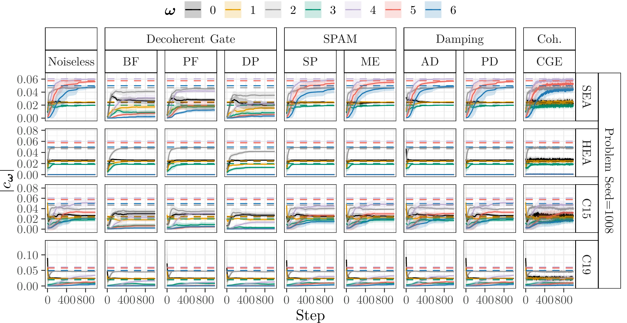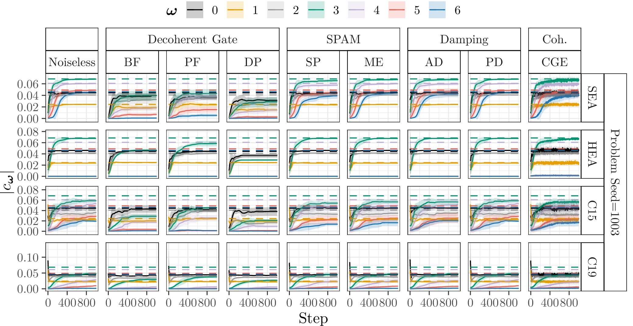 In the following, we show the learned absolute coefficients of the QFMs averaged over ten parameter model initialisation seeds for each single randomly generated probelm instance with seeds \([1000\dots 1009]\) and different types of noise (3%) during training of 1000 steps. In the figures the shaded areas correspond to the standard deviation across the parameter initialisation seeds from the mean. The coefficients of the objective Fourier series are marked with dashed lines.