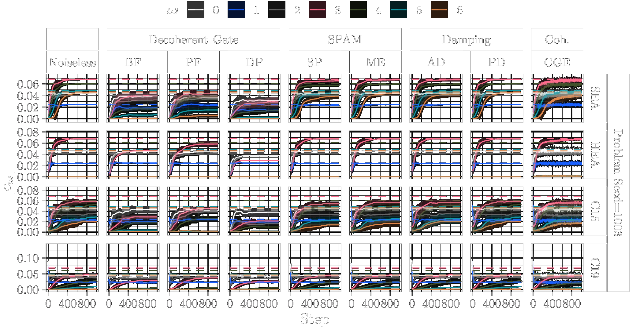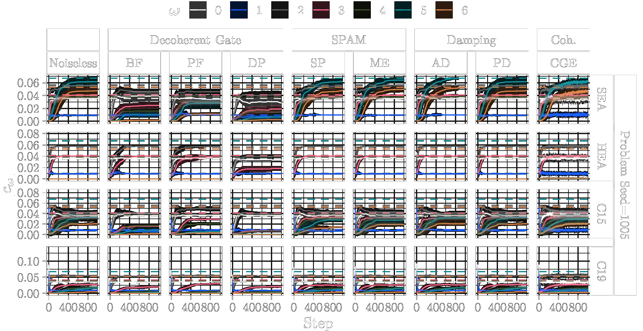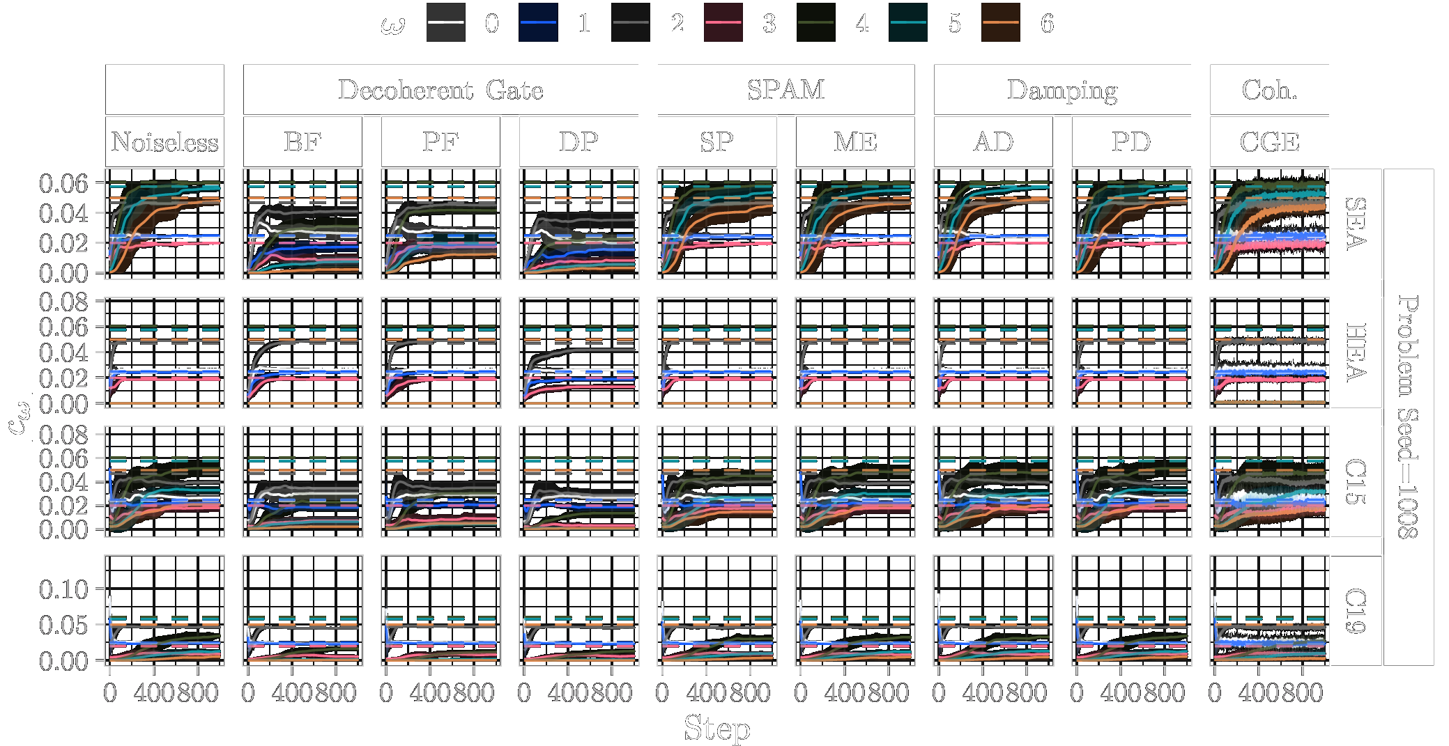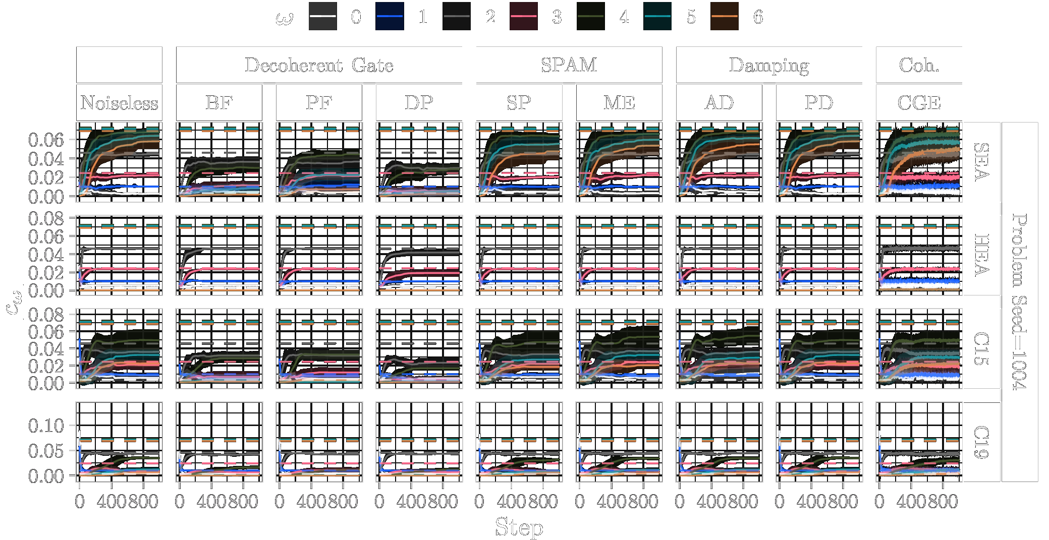 In the following, we show the learned absolute coefficients of the QFMs averaged over ten parameter model initialisation seeds for each single randomly generated probelm instance with seeds \([1000\dots 1009]\) and different types of noise (3%) during training of 1000 steps. In the figures the shaded areas correspond to the standard deviation across the parameter initialisation seeds from the mean. The coefficients of the objective Fourier series are marked with dashed lines.