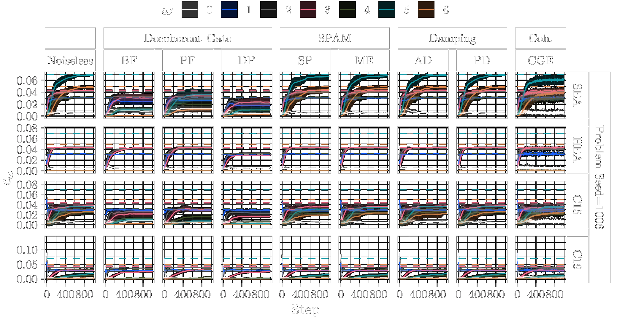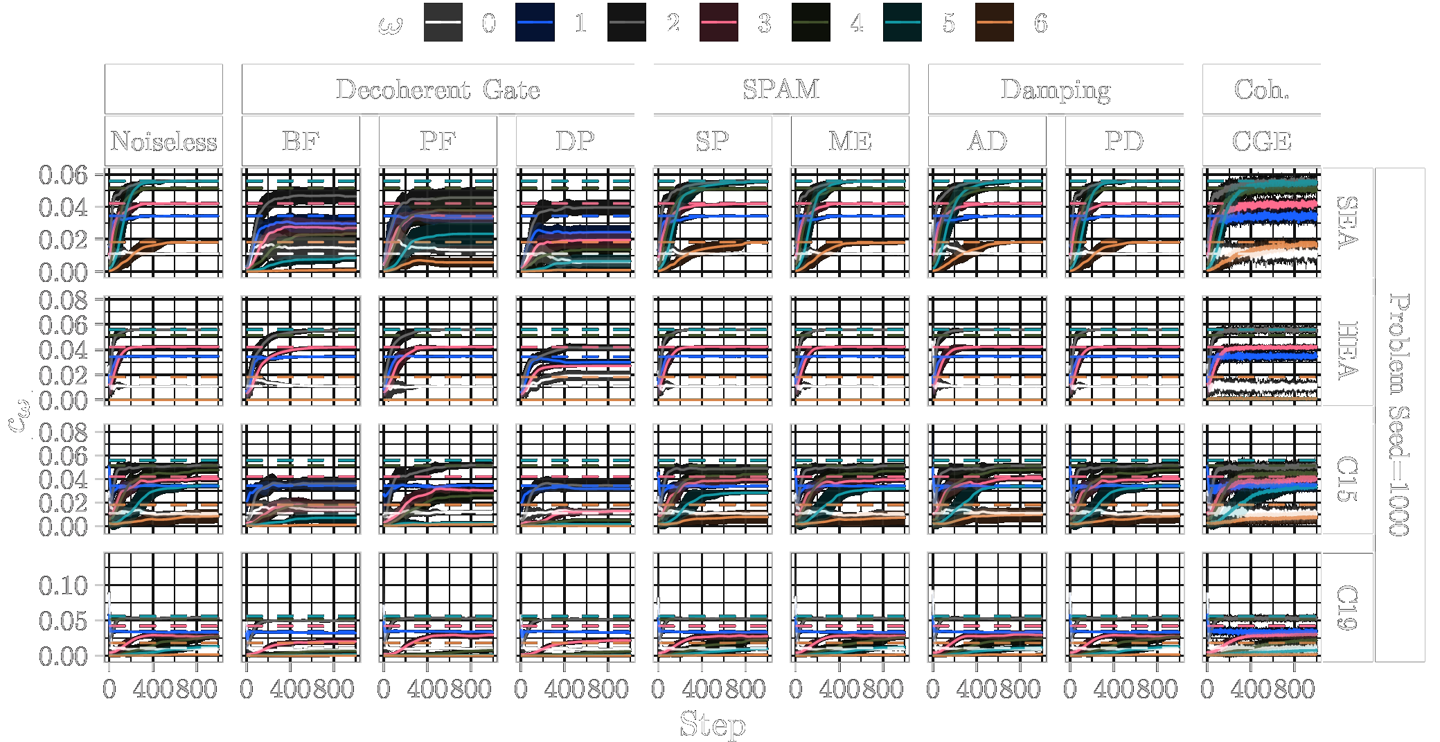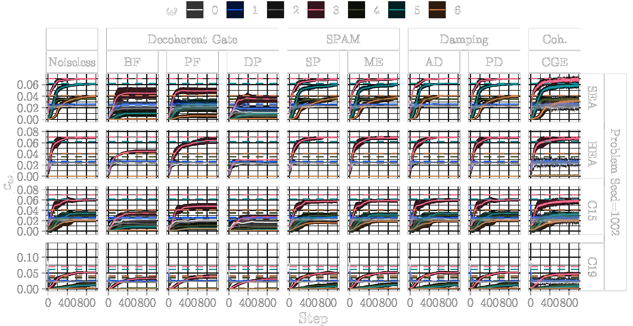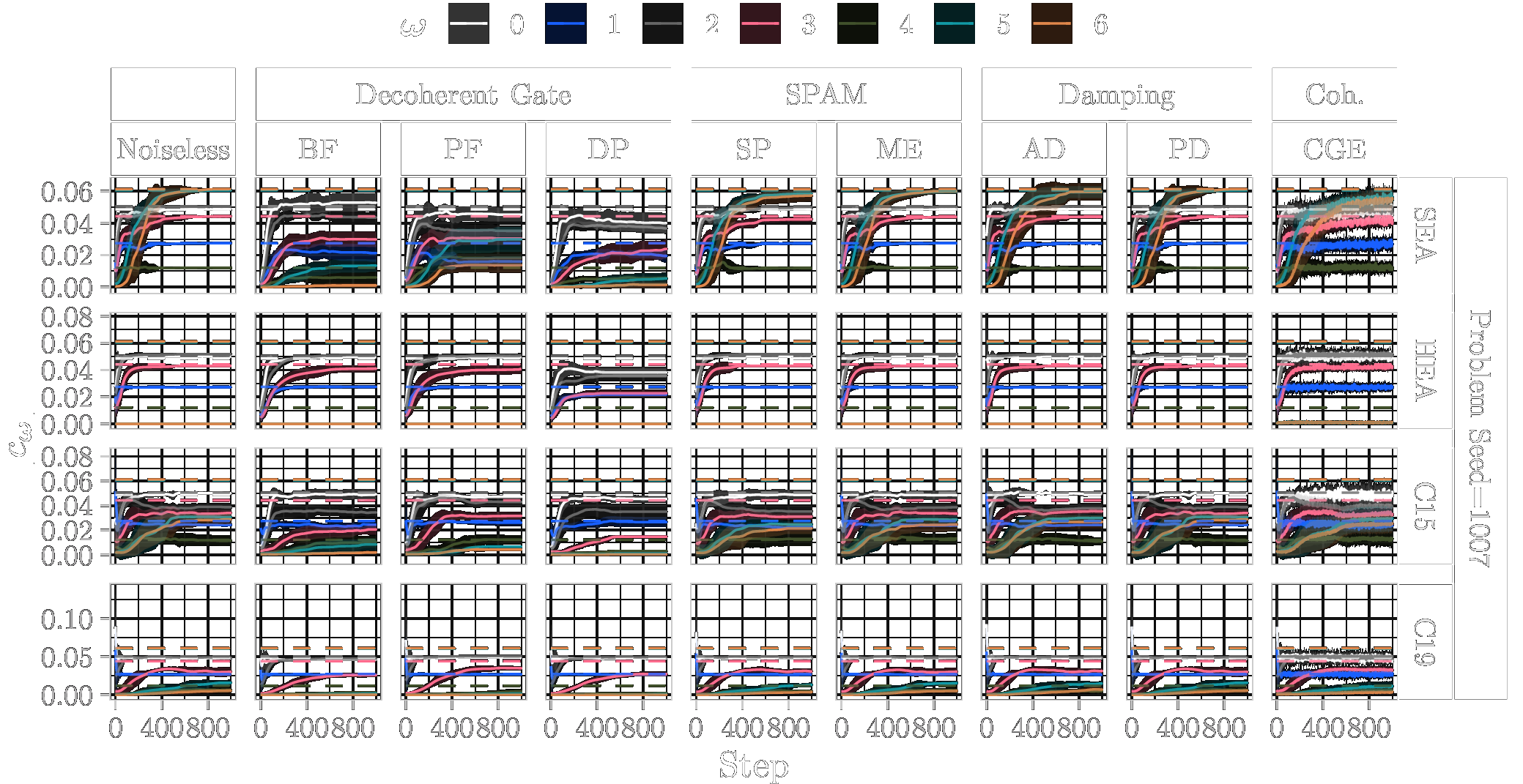 In the following, we show the learned absolute coefficients of the QFMs averaged over ten parameter model initialisation seeds for each single randomly generated probelm instance with seeds \([1000\dots 1009]\) and different types of noise (3%) during training of 1000 steps. In the figures the shaded areas correspond to the standard deviation across the parameter initialisation seeds from the mean. The coefficients of the objective Fourier series are marked with dashed lines.
