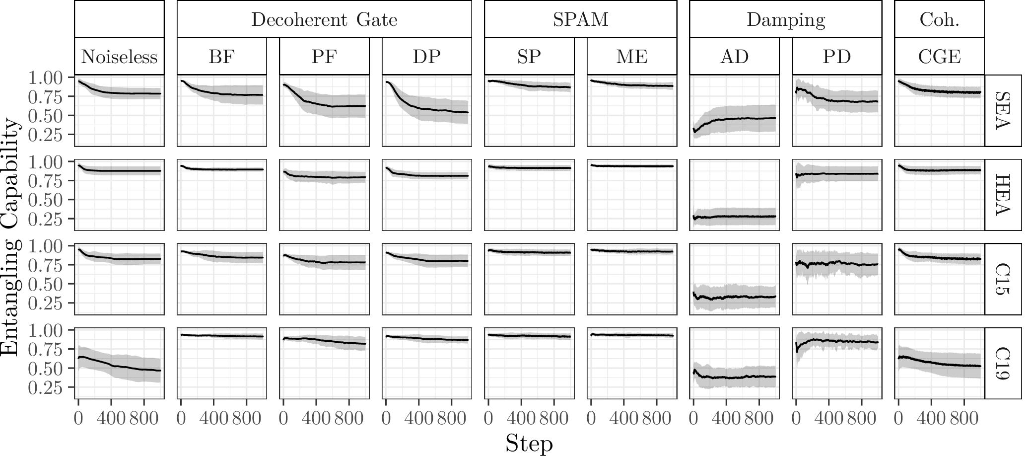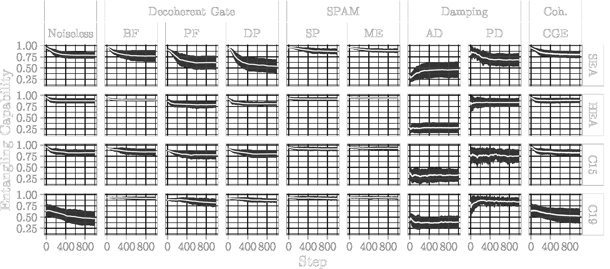 Entangling capability, assessed with the Meyer-Wallach measure for pure states (noiseless and coherent gate errors) and entanglement of formation for mixed states (decoherent-, SPAM- and damping errors) during training. Lines represent the mean over ten parameter initialisation seeds and ten problem generation seeds. Shaded areas represent the standard deviation.