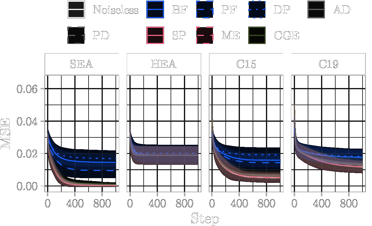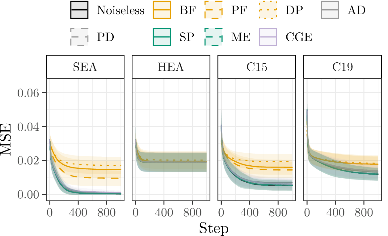 The Mean Squared Error (MSE) over ten parameter initialisation seeds and ten randomly generated problem instances during training. Lines represent the mean, and shaded areas show the standard deviation over the 10 × 10 configurations.